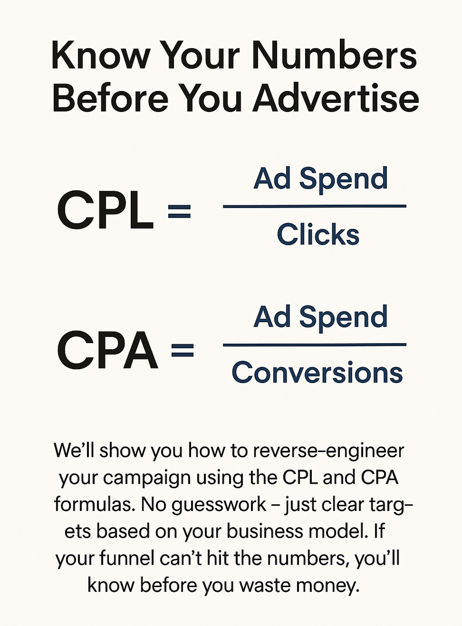 We’ll show you how to reverse-engineer your campaign using the CPL and CPA formulas. No guesswork — just clear targets based on your business model. If your funnel can’t hit the numbers, you’ll know before you waste money.